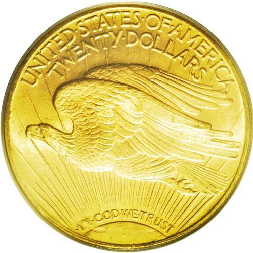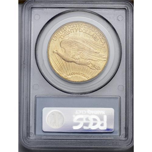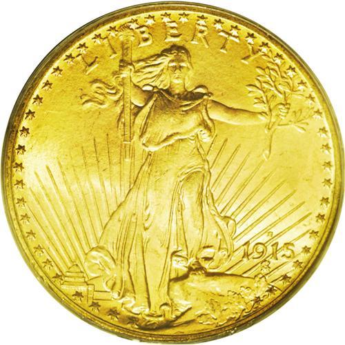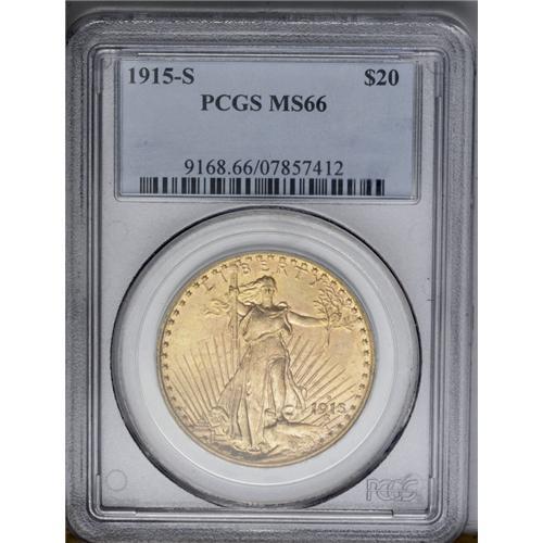 <B>1915-S<$20> MS66 PCGS.</B></I> Fortunately for collectors of this delectable and intriguing series, the 1914-S, 1915-S, and 1916-S can be obtained--although perhaps not readily--even in MS66 grades. Unlike some examples of this issue that suffer from tiny bagmarks, the present specimen is remarkably free of abrasions, and is blessed with a generous strike on its lustrous orange-gold surfaces. The reverse is choice for the grade. PCGS has graded none finer, with a single MS67 example at NGC (5/06).