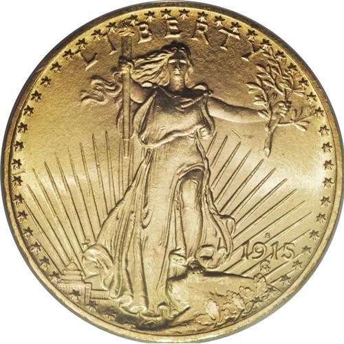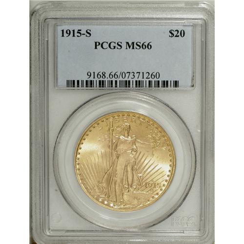<B>1915-S $20 MS66 PCGS.</B></I> The 1915-S is an issue that was shipped overseas in quantity, not only to Europe, but to South America as well. The latter is the source of many of the near-Gems and Gems that appear on the market today. This pretty piece, on the other hand, is of less discernible provenance. The luster is excellent, and the strike, while not full, is entirely appropriate for the grade. A handful of marks are noted on each side. This Premium Gem is tied for the finest certified by PCGS (12/06).<BR><BR><b>Shipping:</b> Coin/Currency (<a target="_blank" href="http://www.heritageauctions.com/common/shipping.php">view shipping information</a>)