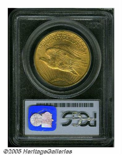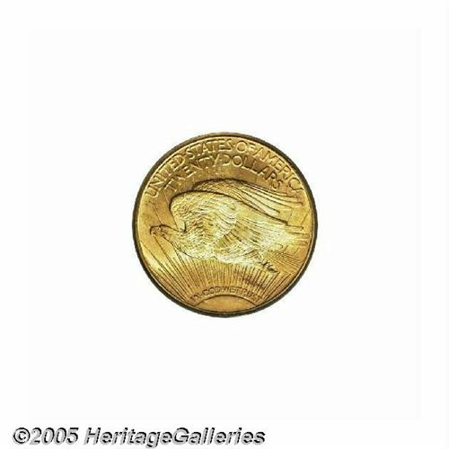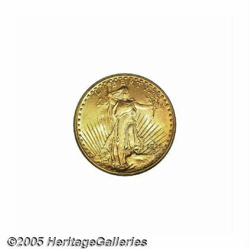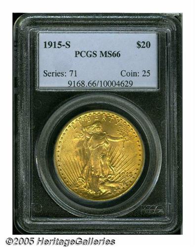 <B>1915-S<$20> MS66 PCGS.</B></I> While a common coin in lower grades, the '15-S is very elusive in this lofty condition. While the usual matte-like surfaces are still present, just about everything else on this coin is atypical. The mint luster is thick and frosted, giving the coin a glowing, granular texture that is very appealing. Rich reddish tinged patina has accrued to each side, and the striking details are fully brought up in all areas. And as one could reasonably infer, each side is refreshingly free from the abrasions that usually plague this issue. Population: 87 in 66, none are finer (6/05).