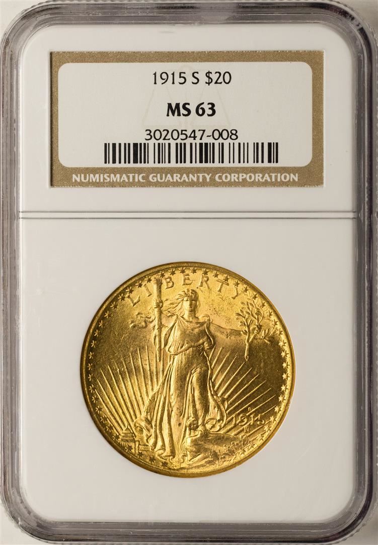 One 1915-S $20 St. Gaudens Double Eagle Gold Coin NGC MS63. NGC Certified.