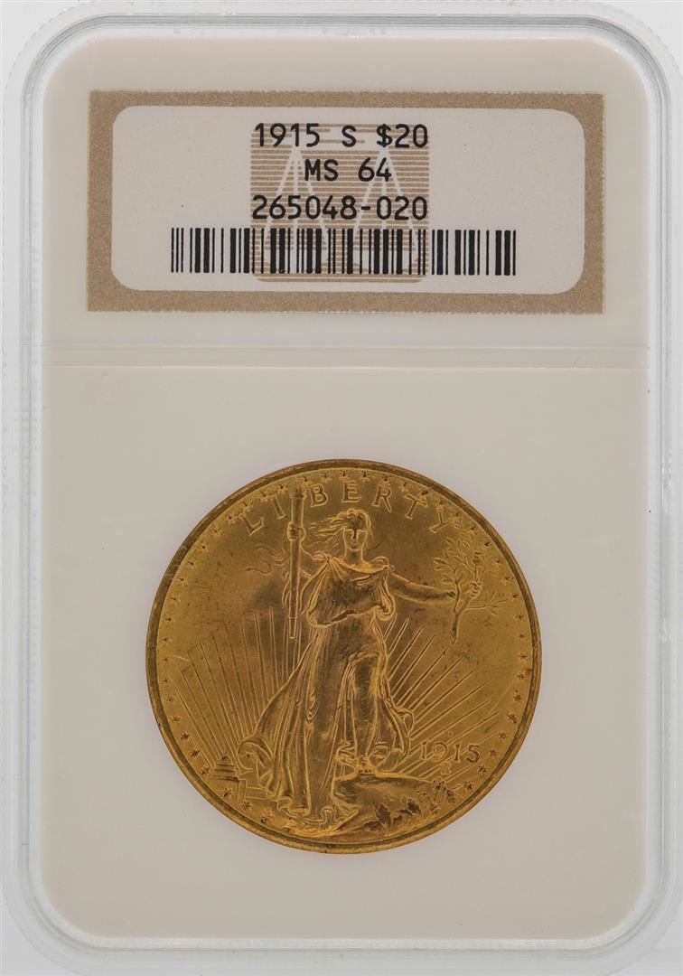 One 1915-S $20 St. Gaudens Double Eagle Gold Coin NGC MS64. NGC Certified.