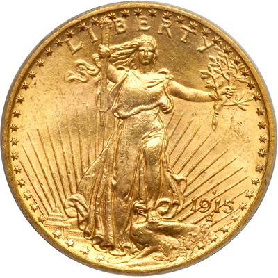 1915-S $20 St. Gaudens. PCGS graded MS-64. Lightly toned and frosty. The surfaces are sleek and glowing with a healthy show of gold color. There is no spotting, the rims are unbroken and very choice (PCGS # 9168) .