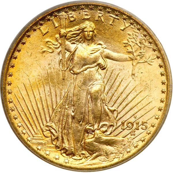 1915-S $20 St. Gaudens. PCGS graded MS-65. Well struck, fully lustrous with hints of delicate golden toning. A glorious Gem! (PCGS # 9168) .