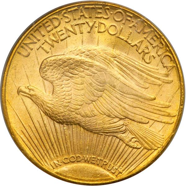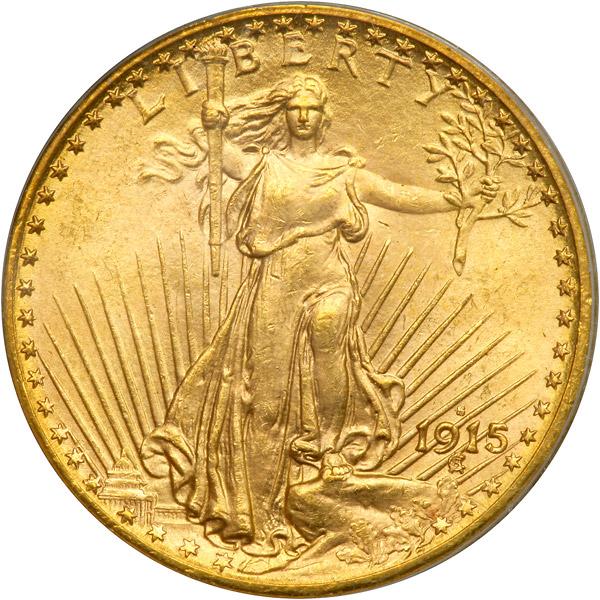 1915-S $20 St. Gaudens. PCGS graded MS-65. Lightly toned, the surfaces are sleek and glowing with a healthy bright iridescence. There is no overt bagmarking on this sharp Double Eagle (PCGS # 9168) .