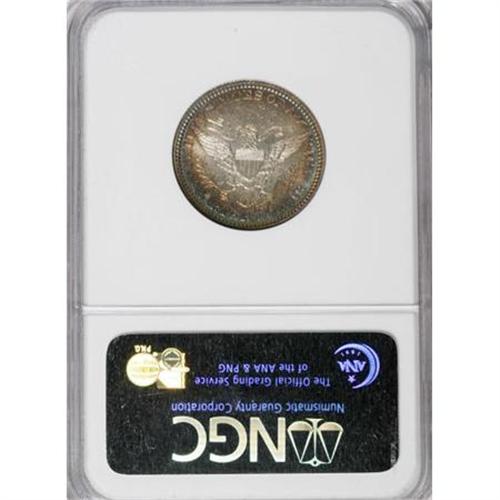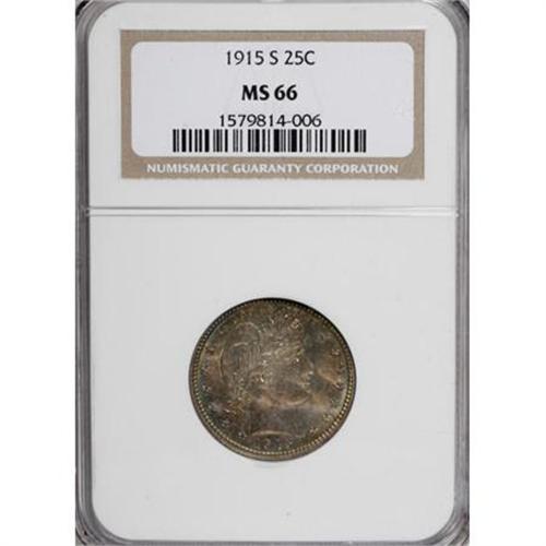 <B>1915-S 25C MS66 NGC.</B></I> Beautiful copper-brown toning covers the obverse, yielding to sky-blue color near the periphery. The reverse is bright and untoned in the center, with rings of lovely red-brown, crimson, and electric-blue iridescence around the border. Well struck and highly lustrous, with a single small milling mark noted on the eagle's shield. Census: 9 in 66, 1 finer (1/08).<BR><BR><B>Coin Engraver:</B> Charles E. Barber<BR><BR><b>Shipping:</b> Coins & Currency (<a target="_blank" href="http://www.heritageauctions.com/common/shipping.php">view shipping information</a>)