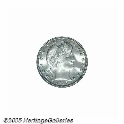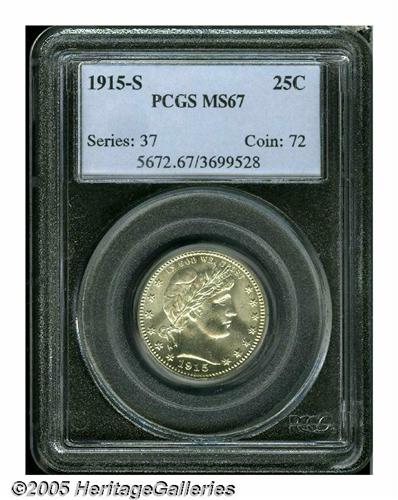 <B>1915-S<25C> MS67 PCGS.</B></I> As far as the San Francisco Mint was concerned, the Barber Quarter passed into history with a limited production of 704,000 pieces in 1915. As befits the series, the rigors of circulation sent most of these coins into oblivion. A precious few specimens, the present example included, were, nonetheless, preserved for the benefit of today's advanced specialist. This is a remarkably bright example with a completely untoned appearance over the obverse and reverse. Both sides are satiny and mark-free with nicely impressed devices. Population: 3 in 67, none are finer (6/05).