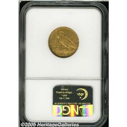 <B>1915-S $5 AU58 NGC.</B></I> Boldly struck and satiny, with smooth, unmarked surfaces that do not reveal any obvious wear on either side. One of the scarcest dates in the Indian half eagle series, this example is nearly of Mint State quality, and is worthy of a strong bid. A single small black spot is noted on the reverse, very close to eight o'clock on the reverse rim. Population: 242 in 58, 129 finer (2/05).