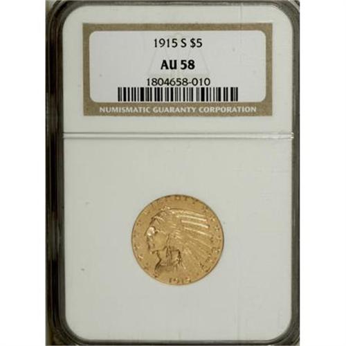 <B>1915-S $5 AU58 NGC.</B></I> NGC Census: (281/148). PCGS Population (85/130). Mintage: 164,000. Numismedia Wsl. Price for NGC/PCGS coin in AU58: $850. (#8531)<BR><BR><B>Coin Engraver:</B> Bela Lyon Pratt<BR><BR><b>Shipping:</b> Coins & Currency (<a target="_blank" href="http://www.heritageauctions.com/common/shipping.php">view shipping information</a>\)