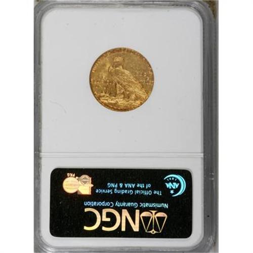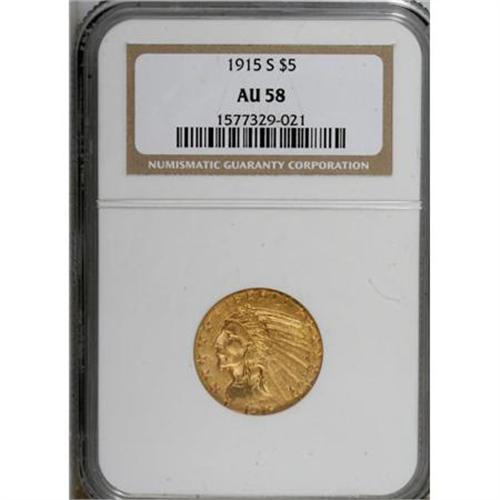 <B>1915-S $5 AU58 NGC.</B></I> The well-defined devices of this luminous near-Mint piece show just a trace of friction. The yellow-orange surfaces show assorted abrasions and a number of wispy marks in the fields. Still, a fundamentally pleasing example of this later Indian half eagle issue.<BR><BR><B>Coin Engraver:</B> Bela Lyon Pratt<BR><BR><b>Shipping:</b> Coins & Currency (<a target="_blank" href="http://www.heritageauctions.com/common/shipping.php">view shipping information</a>)
