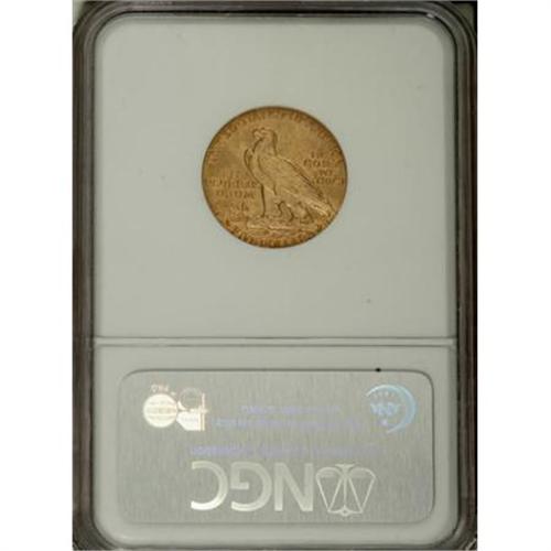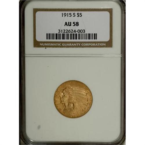 <B>1915-S $5 AU58 NGC.</B></I> A luminous orange-gold exemplar with solid definition for this San Francisco issue. A trace of friction and light, scattered marks are evident on and around the portrait.<BR><BR><B>Coin Engraver:</B> Bela Lyon Pratt<BR><BR><b>Shipping:</b> Coins & Currency (<a target="_blank" href="http://www.heritageauctions.com/common/shipping.php">view shipping information</a>)