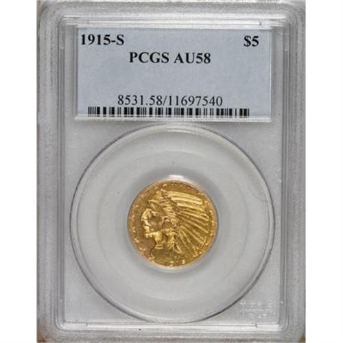 <B>1915-S $5 AU58 PCGS.</B></I> This issue's mintage of 164,000 pieces is less than one-third that of its P-mint counterpart. This well-defined, briefly circulated piece has a brassy appearance with just a touch of friction on the highpoints.<BR><BR><b>Shipping:</b> Coins & Currency (<a target="_blank" href="http://www.heritageauctions.com/common/shipping.php">view shipping information</a>)