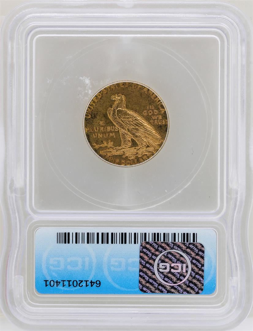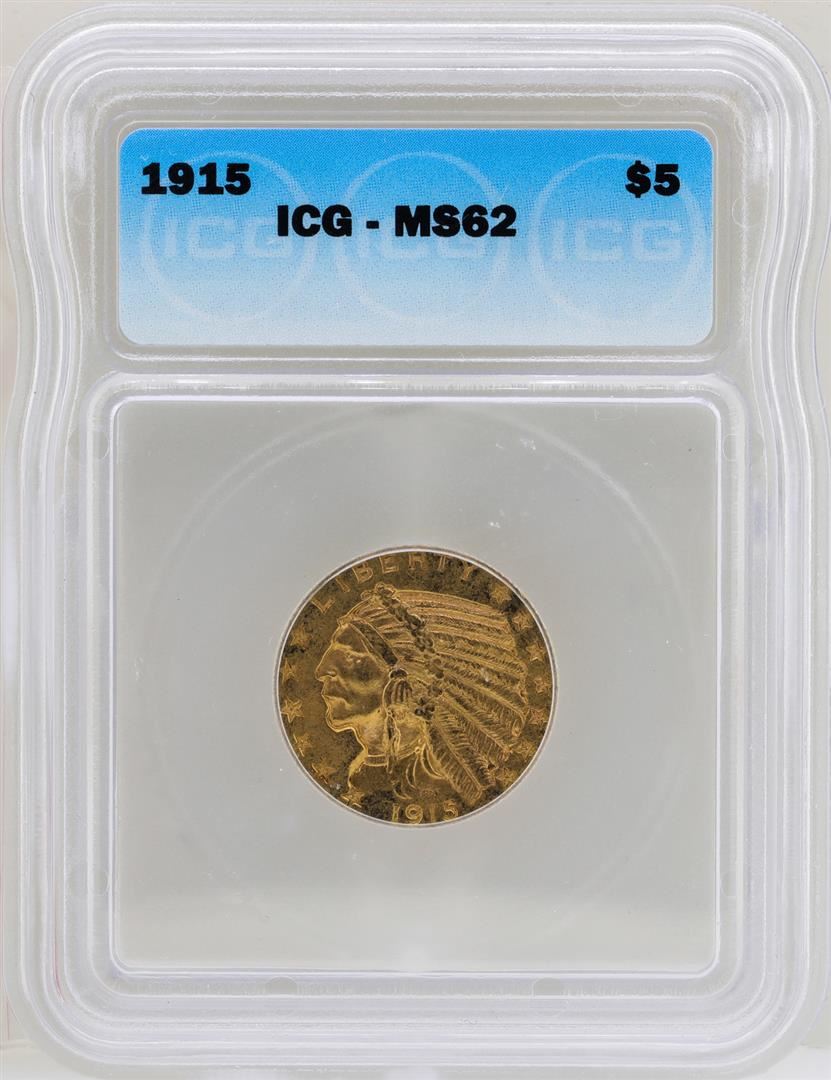 One 1915-S $5 Indian Head Half Eagle Gold Coin ICG MS62. ICG Certified.