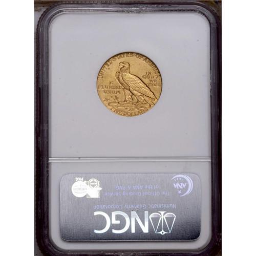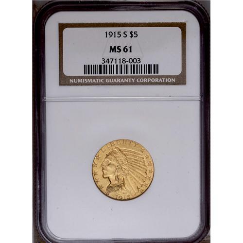 <B>1915-S<$5> MS61 NGC.</B></I> Good luster with a few well scattered marks on each side and a mushy but reasonably distinct mintmark. One of the more challenging Indian half eagle issues in Mint State. Census: 52 in 61, 68 finer (4/06).