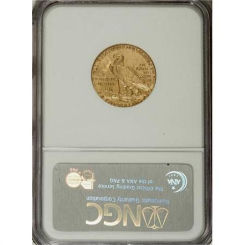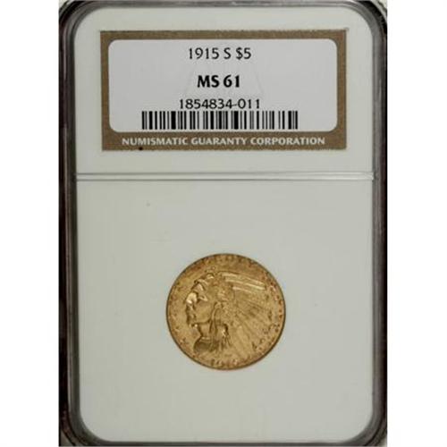 <B>1915-S $5 MS61 NGC.</B></I> Boldly struck with shimmering luster and deep orange-gold toning that yields to pleasing lilac accents near the border areas. Numerous small abrasions are seen on the reverse. According to Garrett and Guth (2006): "This date is very elusive in all grades, particularly so in Mint State, where approximately 250 coins are reported by NGC, ANACS, and PCGS together." <BR><BR><B>Coin Engraver:</B> Bela Lyon Pratt<BR><BR><b>Shipping:</b> Coins & Currency (<a target="_blank" href="http://www.heritageauctions.com/common/shipping.php">view shipping information</a>\)