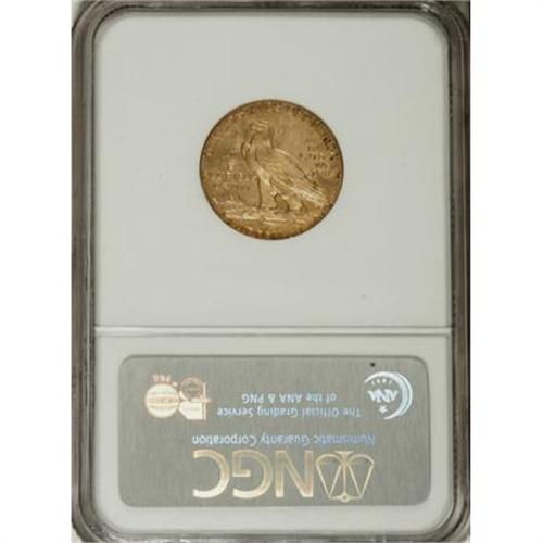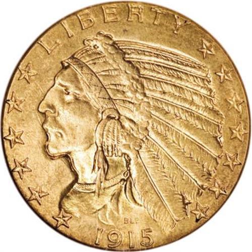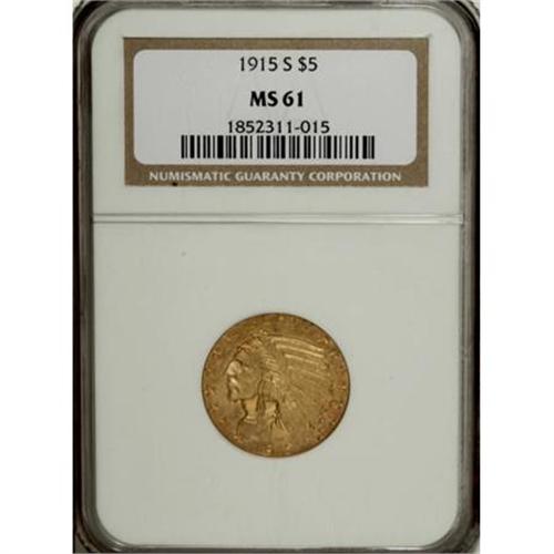 <B>1915-S $5 MS61 NGC.</B></I> The vast majority of 1915-S half eagles entered circulation, and Mint State representatives are conditionally scarce today. This MS61 piece has subtle but complete luster and boldly impressed devices. The surfaces are predominantly pumpkin-orange with small spots of deeper copper color at the upper reverse legend and a lavender-tinged area to the left of the eagle. The obverse is clean for the grade, though an abrasion crosses the TR of TRUST on the opposite side.<BR><BR><B>Coin Engraver:</B> Bela Lyon Pratt<BR><BR><b>Shipping:</b> Coins & Currency (<a target="_blank" href="http://www.heritageauctions.com/common/shipping.php">view shipping information</a>\)