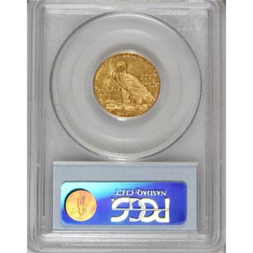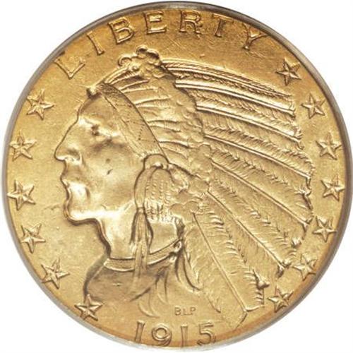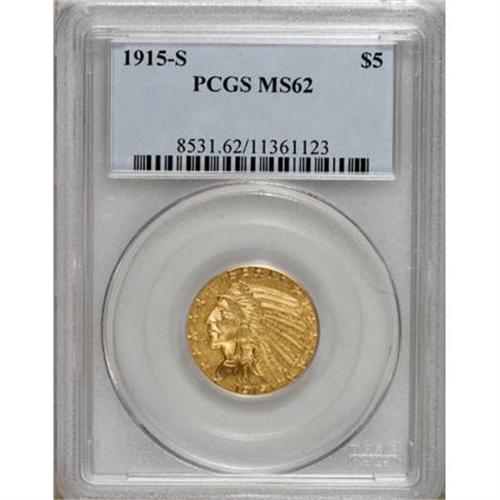 <B>1915-S $5 MS62 PCGS.</B></I> The 164,000-piece 1915-S half eagle is elusive in all grades, especially so in Mint State, where about 270 coins in all grades of Uncirculated are reported by PCGS and NGC. Just 35 Select pieces have been seen, and fewer than 20 near-Gems. The finest certified 1915-S half eagle is a solitary NGC MS65! Honey-gold surfaces yield satiny luster on the MS62 piece for sale here, and sharp definition is apparent on the design elements. Several minute, but grade-defining marks are visible on both sides. Population: 64 in 62, 31 finer (6/07).<BR><BR><b>Shipping:</b> Coins & Currency (<a target="_blank" href="http://www.heritageauctions.com/common/shipping.php">view shipping information</a>)