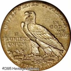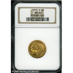 <B>1915-S $5 MS63 NGC.</B></I> Only slightly less rare than the 1914-S, the 1915-S is a low mintage (164,000 pieces) issue that is elusive in all Mint State grades. Both sides of this coin are bright and lustrous with a frosty, slightly granular texture. Scattered bagmarks in the reverse field limit the grade, but not the eye appeal of this golden-rose example. Typically struck for the issue with a rather weak mintmark. Population: 17 in 63, with only nine coins finer (1/05). Lot:8711