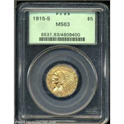 <table><tr><td><TABLE cellSpacing=0 cellPadding=0 width="100%" bgColor=#000000 border=0><TBODY> <TR><TD width="100%"><TABLE cellSpacing=1 cellPadding=3 width="100%" border=0><TBODY><TR><TD width="100%" bgColor=#79735c><FONT face=arial color=#ffffff size=3><B>Description</B> </FONT></TD></TR><TR><TD width="100%" bgColor=#ffffff><FONT face=arial size=2><B>1915-S $5 MS63 PCGS.</B></I> Only slightly less rare than the 1914-S, the 1915-S is a low mintage (164,000 pieces) issue that is elusive in all Mint State grades. Both sides of this coin are bright and lustrous with a frosty, slightly granular texture. Scattered bagmarks in the obverse and reverse fields limit the grade, but not the eye appeal of this golden-rose example. Typically struck for the issue. Population: 20 in 63, 8 finer (10/03).<BR><I>From the Holman Family Collection.</B></I> </FONT></TD></TR></TBODY></TABLE></TD></TR></TBODY></TABLE><BR><A name=PricesRealized></A><TABLE cellSpacing=0 cellPadding=0 width="100%" bgColor=#000000 border=0><TBODY><TR><TD width="100%"><TABLE cellSpacing=1 cellPadding=3 width="100%" border=0><TBODY><TR><TD width="100%" bgColor=#79735c><A name=PR><FONT face=arial color=#ffffff size=3><B>Previous Prices from Heritage Auctions</B> </FONT></A></TD></TR><TR><TD bgColor=#f6f6ed><TABLE cellSpacing=0 cellPadding=0 width="100%" border=1><TBODY><TR><TD align=middle width="33%"><B>Date</B></TD><TD align=middle width="33%"><B>Service</B></TD><TD align=middle width="33%"><B>Price</B></TD></TR><TR bgColor=whitesmoke><TD width="33%"><B>09/20/2003</B></TD><TD width="33%">PCGS</TD><TD width="33%">$14,950.00</TD></TR><TR bgColor=whitesmoke><TD width="33%"><B>01/05/2001</B></TD><TD width="33%">NGC</TD><TD width="33%">$6,612.50</TD></TR><TR bgColor=whitesmoke><TD width="33%"><B>07/31/1993</B></TD><TD width="33%">PCGS</TD><TD width="33%">$15,950.00</TD></TR><TR bgColor=whitesmoke><TD width="33%"><B>05/01/1999</B></TD><TD width="33%">PCGS</TD><TD width="33%">$8,625.00</TD></TR></TBODY></TABLE></TD></TR><TR><TD bgColor=#ffffff><FONT face=arial size=1 ?>PLEASE NOTE: All prices realized reflect the final hammer price PLUS the buyer's premium in auctions that charge a buyer's premium. Each item has a notation at the top of the listing indicating whether that lot included a buyer's premium. Example: A item that sells with a final hammer price of $100 and a 20% buyer's premium will display with a price realized of $120. All information listed is intended to be as accurate as possible, but errors are possible. Please use this guide carefully and inform us of any inaccuracies. </FONT></TD></TR></TBODY></TABLE></TD></TR></TBODY></TABLE><BR><TABLE cellSpacing=0 cellPadding=0 width="100%" bgColor=#000000 border=0><TBODY><TR><TD width="100%"><TABLE cellSpacing=1 cellPadding=3 width="100%" border=0><TBODY><TR><TD width="100%" bgColor=#79735c colSpan=6><FONT face=arial color=#ffffff size=3><B>Price Guide*</B> </FONT></TD></TR><TR bgColor=#f6f6ed><TD align=middle><B>Grade</B> </TD><TD align=middle><B>Coin World<BR>(Trends)</B> </TD><TD align=middle><B>Numismedia<BR>Retail</B> </TD><TD align=middle><B>Numismedia<BR>Wholesale</B> </TD><TD align=middle><B>Coin<BR>Universe</B> </TD><TD align=middle><B>Heritage<BR>Value Index</B> </TD></TR><TR bgColor=#ffffff><TD align=middle>62</TD><TD align=right>$4,600.00</TD><TD align=right>---</TD><TD align=right>$3,150.00</TD><TD align=right>$5,525.00</TD><TD align=right>$4,011.00</TD></TR><TR style="FONT-WEIGHT: bold" bgColor=#cccfdd><TD align=middle>63</TD><TD align=right>$12,500.00</TD><TD align=right>---</TD><TD align=right>$8,125.00</TD><TD align=right>$9,750.00</TD><TD align=right>$7,393.75</TD></TR><TR bgColor=#ffffff><TD align=middle>64</TD><TD align=right>$32,000.00</TD><TD align=right>---</TD><TD align=right>$20,000.00</TD><TD align=right>$25,000.00</TD><TD align=right>$19,300.00</TD></TR><TR bgColor=#ffffff><TD colSpan=6><FONT size=1>*All information listed is intended to be as accurate as possible, but errors are possible. No item may be returned or refused based on this information which is provided as a service to our customers. You should contact each pricing source directly to determine the accuracy of this information. </FONT></TD></TR></TBODY></TABLE></TD></TR></TBODY></TABLE><BR><TABLE cellSpacing=0 cellPadding=0 width="100%" bgColor=#000000 border=0><TBODY><TR><TD width="100%"><TABLE cellSpacing=1 cellPadding=3 width="100%" border=0><TBODY><TR><TD width="100%" bgColor=#79735c><FONT face=arial color=#ffffff size=3><B>Population Guide</B> </FONT></TD></TR><TR bgColor=#ffffff><TD align=middle><!-- Begin Output of Population Grid--><TABLE cellSpacing=0 cellPadding=0 width="100%" border=0><TBODY><TR><TD vAlign=center><TABLE cellSpacing=0 width="100%" border=1 cellsadding="3"><TBODY><TR><TD vAlign=center><TABLE cellSpacing=0 cellPadding=3 width="100%" border=1><TBODY><TR><TD vAlign=center align=middle bgColor=#f0f1e8 colSpan=2 <CENTER><FONT face=Arial size=2><B>PCGS Pop </B></FONT><CENTER></CENTER></TD><TD vAlign=center align=middle bgColor=#f0f1e8 colSpan=2><CENTER><FONT face=Arial size=2><B>NGC Pop</B></CENTER></FONT></TD></TR><TR><TD vAlign=center><FONT face=Arial size=2>(63)</FONT> </TD><TD vAlign=center align=right><FONT face=Arial size=2>20</FONT> </TD><TD vAlign=center><FONT face=Arial size=2>(63)</FONT> </TD><TD vAlign=center align=right><FONT face=Arial size=2>16</FONT> </TD></TR><TR><TD vAlign=center><FONT face=Arial size=2>(>63)</FONT> </TD><TD vAlign=center align=right><FONT face=Arial size=2>8</FONT> </TD><TD vAlign=center><FONT face=Arial size=2>(>63)</FONT> </TD><TD vAlign=center align=right><FONT face=Arial size=2>8</FONT> </TD></TR></TBODY></TABLE></TD></TR></TBODY></TABLE></TD></TR></TBODY></TABLE><!-- End Output of Population Grid--></TD></TR></TBODY></TABLE></TD></TR></TBODY></TABLE><BR><TABLE cellSpacing=0 cellPadding=0 width="100%" bgColor=#000000 border=0><TBODY><TR> Important notice: Heritage usually auctions material at the rate of 200-250 lots per hour. On som