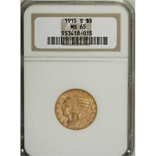 <B>1915-S $5 MS65 NGC.</B></I> Between 1908 and 1929, four mints produced 24 different Indian half eagle issues. Although the 1915-S five is not a standout in terms of recorded mintage-it ranks fourth with a total of 164,000 coins struck-it is prominent as a conditional rarity above the MS63 level, perhaps equal to or slightly second to the 1914-S. An analysis of the NGC <I>Census Report</B></I> and the PCGS <I>Population Report</B></I> (3/08) provides insight into just how rare these two S-mint Indian half eagles actually are in terms of condition. For example, they are the only two issues in the entire series to have a population of a single coin at the MS65 level with none grading finer at both services combined. Furthermore, both the 1914-S and the 1915-S are the only two coins in the series to not have a coin graded above the MS64 level at PCGS. Even the 1909-O, one of the keys to the series and the lowest mintage Indian half eagle at 34,200 pieces, has had four coins graded at the Gem or better level at the two services collectively. Even the most challenging coin of the Indian fives in terms of overall rarity in all grades, the 1929, is more available in MS64 or finer condition than the 1915-S. <BR> The reason for the conditional rarity of the late date S-mint half eagles is that all coins struck were apparently released into circulation. During the early 1900s, circulating coinage was in short supply and desperately needed to meet the demands of a booming West Coast economy. As a result, few coins were saved early on and, as a result, we have a limited number of Mint State pieces available for collectors today. David Akers perhaps said it best in 1979: "Strictly Uncirculated examples are very rare and Choice or Gem quality Mint State pieces are almost impossible to obtain. This date is the rarest S-mint half eagle in any grade and is also [rarer] in Choice Mint State than the 1909-S, 1910-S, 1912-S, 1913-S, 1914-S and 1916-S. In fact, a strong argument could be made that it is the rarest Indian Head half eagle in Choice condition, its only competition coming from the 1909-O and the 1911-D which are also extremely rare in full Mint State." <BR> Any '15-S half eagle survivor in Gem condition-the current coin being the only example-would have been by pure happenstance. Perhaps a bank employee saved one as souvenir, or maybe a San Francisco Mint worker kept a nice example as a memento of his job. We will never know for certain, but numismatists are thankful that at least one Gem piece has survived for future generations of collectors. Unfortunately, once this specimen is sold it may be off of the market for years to come. Of course, we do not know that for certain, but special coins, such as this finest known 1915-S five dollar, do tend to become the prized centerpieces of serious cabinets. When one considers the aforementioned population figures, and the fact that the finest 1915-S five in the Smithsonian Institution is a cleaned AU coin, the importance of a Gem 1915-S is undeniable.<BR> This is a magnificent example that shows a lovely interplay of reddish-golden and pale lilac color. Strongly struck, the only exception is the lowest feather of the headdress, as usually seen on this design type. The only mark that could be used as a future pedigree identifier is a vertical abrasion just below the Indian's chin.<BR><BR><B>Coin Engraver:</B> Bela Lyon Pratt<BR><BR><b>Shipping:</b> Coins & Currency (<a target="_blank" href="http://www.heritageauctions.com/common/shipping.php">view shipping information</a>)