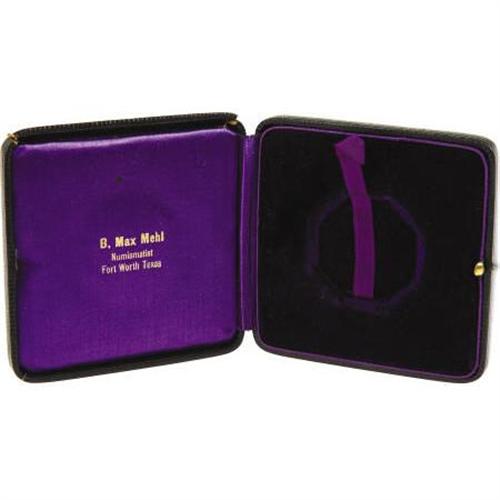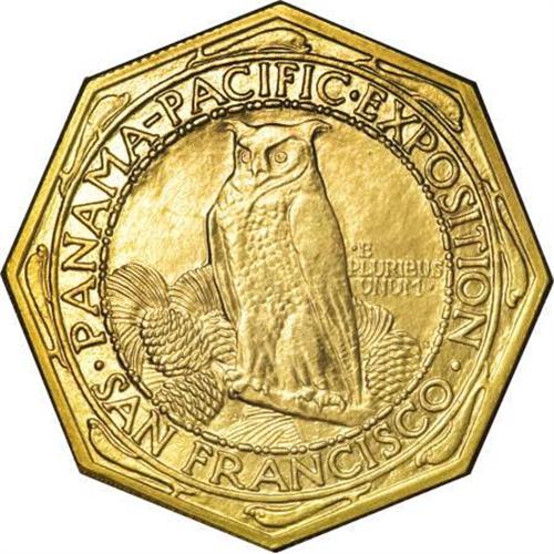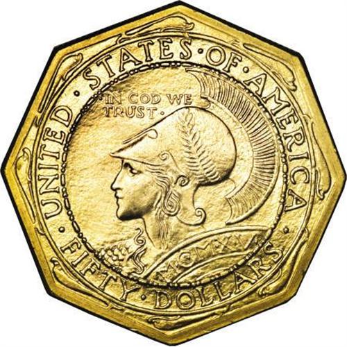 <B>1915-S $50 Panama-Pacific 50 Dollar Octagonal MS60 Uncertified.</B></I> Bowers writes that the 1915 Panama-Pacific Exposition was a "showcase for sculpture and art" on a scale then unparalleled. Sculptor Robert Aitken produced a water display at the titled <I>The Fountain of the Earth. </B></I>The monumental production was set in the Court of Abundance at the expo, featuring many figures plus a colossal sculpture of Hermes, with outstretched arms grasping reptiles--"suggestive of earliest forms of earth life, from the mouths of which streams of water are thrown all over the globe; steam clouds shrouded by night." (Bowers, <I>Commemorative Coins of the United States: A Complete Encyclopedia.) </B></I>Aitken also produced a bust of William Howard Taft (U.S. president, 1909-1913) and a statue of Renaissance sculptor Michelangelo that were near the Palace of Fine Arts. Near the Sunken Gardens, at the center of the Court of the Sun and Stars, Aitken's heroic sculptures <I>Earth, Air, Fire, </B></I>and <I>Water </B></I>were on display. <BR> Numerous sculptors who already had or would in the future have numismatic associations or design commemorative coins exhibited their works at the exposition. Aitken, of course, was already known as the designer of the famed fifty dollar commemorative coins sold only at the exposition, in round and octagonal formats. The octagonal format, reminding many collectors of the 1851-52 octagonal Gold Rush slugs, were the more popular of the two options. <BR> The present coin shows pleasing yellow-gold surfaces that are free of rub, even on the exposed highpoint of the cheek of Minerva, but light hairlines on each side attest to an old cleaning. This lot comes complete with a purple velvet-lined black snap box, similar to the original-issue boxes but made up by famed Fort Worth, Texas, numismatist B. Max Mehl, whose imprint in gold is stamped on the inside front cover.<BR><BR><b>Shipping:</b> Coins & Currency (<a target="_blank" href="http://www.heritageauctions.com/common/shipping.php">view shipping information</a>)