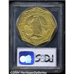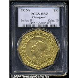 <table><tr><td><TABLE cellSpacing=0 cellPadding=0 width="100%" bgColor=#000000 border=0><TBODY> <TR><TD width="100%"><TABLE cellSpacing=1 cellPadding=3 width="100%" border=0><TBODY><TR><TD width="100%" bgColor=#79735c><FONT face=arial color=#ffffff size=3><B>Description</B> </FONT></TD></TR><TR><TD width="100%" bgColor=#ffffff><FONT face=arial size=2><B>1915-S $50 Panama-Pacific 50 Dollar Octagonal MS63 PCGS.</B></I> Struck on the eve of America's involvement in the First World War, the Greek helmet is pushed back on Minerva's head in a ready but not fully combative posture. The owl on the reverse signifies watchfulness. Minted in slightly larger numbers than the round commemorative of similar design (645 vs. 483 pieces), the equally massive octagonal piece adds dolphins about the borders symbolizing America's desire to keep the Panama Canal open throughout the term of the Great War. Both obverse and reverse of this massive issue exhibit a bright, glossy luster over surfaces that exhibit rich orange-gold color. The only grade-limiting factors are a minor facial mark and modest friction on the owl's leg and wing feathers. A pleasing and well preserved example of this famous and perennially popular type. </FONT></TD></TR></TBODY></TABLE></TD></TR></TBODY></TABLE><BR><A name=PricesRealized></A><TABLE cellSpacing=0 cellPadding=0 width="100%" bgColor=#000000 border=0><TBODY><TR><TD width="100%"><TABLE cellSpacing=1 cellPadding=3 width="100%" border=0><TBODY><TR><TD width="100%" bgColor=#79735c><A name=PR><FONT face=arial color=#ffffff size=3><B>Previous Prices from Heritage Auctions</B> </FONT></A></TD></TR><TR><TD bgColor=#f6f6ed><TABLE cellSpacing=0 cellPadding=0 width="100%" border=1><TBODY><TR><TD align=middle width="33%"><B>Date</B></TD><TD align=middle width="33%"><B>Service</B></TD><TD align=middle width="33%"><B>Price</B></TD></TR><TR bgColor=whitesmoke><TD width="33%"><B>01/28/2004</B></TD><TD width="33%">NGC</TD><TD width="33%">$42,550.00</TD></TR><TR bgColor=whitesmoke><TD width="33%"><B>07/30/2002</B></TD><TD width="33%">PCGS</TD><TD width="33%">$26,450.00</TD></TR><TR bgColor=whitesmoke><TD width="33%"><B>08/08/2001</B></TD><TD width="33%">NGC</TD><TD width="33%">$32,200.00</TD></TR><TR bgColor=whitesmoke><TD width="33%"><B>02/11/2000</B></TD><TD width="33%">PCGS</TD><TD width="33%">$28,750.00</TD></TR><TR bgColor=whitesmoke><TD width="33%"><B>08/13/1999</B></TD><TD width="33%">PCGS</TD><TD width="33%">$41,400.00</TD></TR></TBODY></TABLE></TD></TR><TR><TD bgColor=#ffffff><FONT face=arial size=1 ?>PLEASE NOTE: All prices realized reflect the final hammer price PLUS the buyer's premium in auctions that charge a buyer's premium. Each item has a notation at the top of the listing indicating whether that lot included a buyer's premium. Example: A item that sells with a final hammer price of $100 and a 20% buyer's premium will display with a price realized of $120. All information listed is intended to be as accurate as possible, but errors are possible. Please use this guide carefully and inform us of any inaccuracies. </FONT></TD></TR></TBODY></TABLE></TD></TR></TBODY></TABLE><BR><TABLE cellSpacing=0 cellPadding=0 width="100%" bgColor=#000000 border=0><TBODY><TR><TD width="100%"><TABLE cellSpacing=1 cellPadding=3 width="100%" border=0><TBODY><TR><TD width="100%" bgColor=#79735c colSpan=6><FONT face=arial color=#ffffff size=3><B>Price Guide*</B> </FONT></TD></TR><TR bgColor=#f6f6ed><TD align=middle><B>Grade</B> </TD><TD align=middle><B>Coin World<BR>(Trends)</B> </TD><TD align=middle><B>Numismedia<BR>Retail</B> </TD><TD align=middle><B>Numismedia<BR>Wholesale</B> </TD><TD align=middle><B>Coin<BR>Universe</B> </TD><TD align=middle><B>Heritage<BR>Value Index</B> </TD></TR><TR bgColor=#ffffff><TD align=middle>62</TD><TD align=right>---</TD><TD align=right>---</TD><TD align=right>$26,000.00</TD><TD align=right>$32,500.00</TD><TD align=right>$26,191.67</TD></TR><TR style="FONT-WEIGHT: bold" bgColor=#cccfdd><TD align=middle>63</TD><TD align=right>$40,000.00</TD><TD align=right>---</TD><TD align=right>$33,500.00</TD><TD align=right>$38,000.00</TD><TD align=right>$33,006.25</TD></TR><TR bgColor=#ffffff><TD align=middle>64</TD><TD align=right>$55,000.00</TD><TD align=right>---</TD><TD align=right>$42,500.00</TD><TD align=right>$51,500.00</TD><TD align=right>$40,050.00</TD></TR><TR bgColor=#ffffff><TD colSpan=6><FONT size=1>*All information listed is intended to be as accurate as possible, but errors are possible. No item may be returned or refused based on this information which is provided as a service to our customers. You should contact each pricing source directly to determine the accuracy of this information. </FONT></TD></TR></TBODY></TABLE></TD></TR></TBODY></TABLE><BR><TABLE cellSpacing=0 cellPadding=0 width="100%" bgColor=#000000 border=0><TBODY><TR><TD width="100%"><TABLE cellSpacing=1 cellPadding=3 width="100%" border=0><TBODY><TR><TD width="100%" bgColor=#79735c><FONT face=arial color=#ffffff size=3><B>Population Guide</B> </FONT></TD></TR><TR bgColor=#ffffff><TD align=middle><!-- Begin Output of Population Grid--><TABLE cellSpacing=0 cellPadding=0 width="100%" border=0><TBODY><TR><TD vAlign=center><TABLE cellSpacing=0 width="100%" border=1 cellsadding="3"><TBODY><TR><TD vAlign=center><TABLE cellSpacing=0 cellPadding=3 width="100%" border=1><TBODY><TR><TD vAlign=center align=middle bgColor=#f0f1e8 colSpan=2 <CENTER><FONT face=Arial size=2><B>PCGS Pop </B></FONT><CENTER></CENTER></TD><TD vAlign=center align=middle bgColor=#f0f1e8 colSpan=2><CENTER><FONT face=Arial size=2><B>NGC Pop</B></CENTER></FONT></TD></TR><TR><TD vAlign=center><FONT face=Arial size=2>(63)</FONT> </TD><TD vAlign=center align=right><FONT face=Arial size=2>160</FONT> </TD><TD vAlign=center><FONT face=Arial size=2>(63)</FONT> </TD><TD vAlign=center align=right><FONT face=Arial size=2>0</FONT> </TD></TR><TR><TD vAlign=center><FONT face=Arial size=2>(>63)</FONT> </TD><TD vAlign=center align=right><FONT face=Arial siz