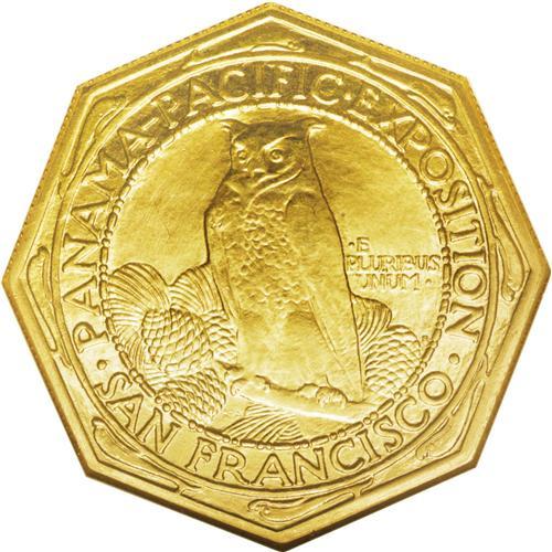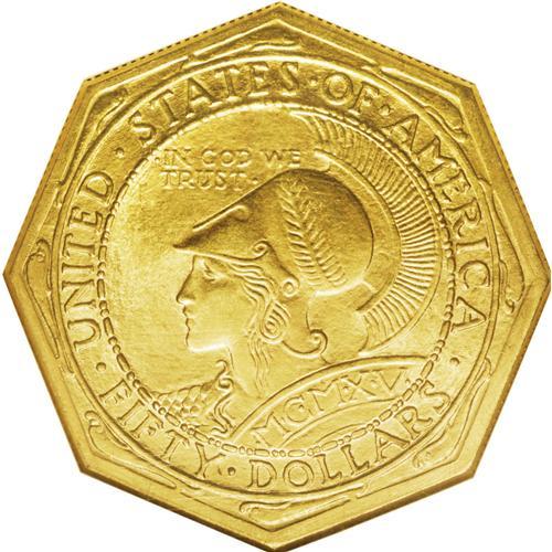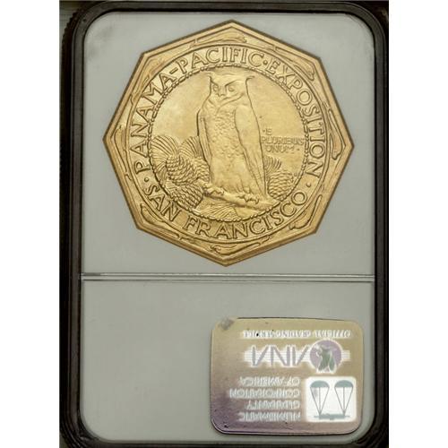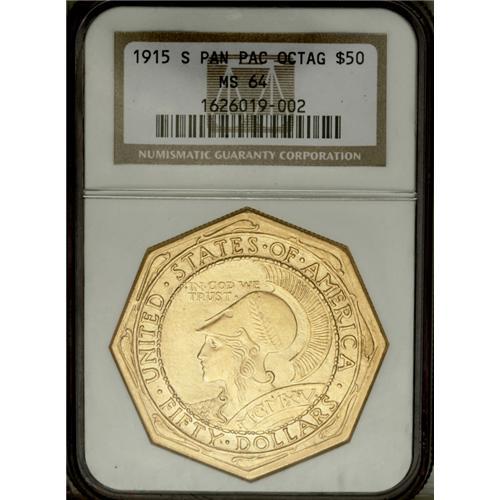<B>1915-S $50 Panama-Pacific 50 Dollar Octagonal MS64 NGC.</B></I> Octagonal fifty dollar slugs were struck by the U.S. Assay Office of Gold in the years preceding the San Francisco Mint. However, there is only one octagonal issue from the U.S. Mint. That is the octagonal variety of the Panama-Pacific gold fifty dollar commemorative. A round fifty dollar variety was also struck, and its mintage of 483 pieces makes it even more rare than the octagonal version, which has a tiny production of 645 pieces. The designs for the two issues are similar. Both show Minerva, a.k.a. Athena, adorned with an Athenian helmet and shield. The shield bears the date in Roman numerals, MCMXV. This classical but alert military pose was suitable, considering World War I was raging in Europe and could bring in the United States at any time. The reverse features Athena's owl, symbolic of wisdom. The octagonal variety shows these motifs in slightly reduced scale, relative to the round issue. The octagonal variety adds eight dolphins across both peripheries. Dolphins are symbols of good luck, and often accompanied vessels on their way through the Panama Canal.<BR> The present near-Gem has full satin luster and seamless canary-gold toning. The strike is complete. The unaided eye can locate only a single thin mark, located on the reverse field just left of the owl. Once a glass is used, patient observation finds a wispy pinscratch on the obverse above the G in GOD. These two imperfections are of little relevance, particularly given the large diameter of this hefty gold commemorative. The eye appeal is significant. The fifty dollar gold Panama-Pacific varieties are the two keys of the entire U.S. commemorative series, and the present near-Gem is a worthy representative that would highlight any collection.<BR><BR><b>Shipping:</b> Coin/Currency (<a target="_blank" href="http://www.heritageauctions.com/common/shipping.php">view shipping information</a>)