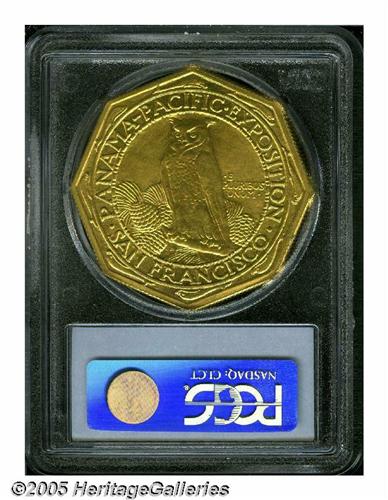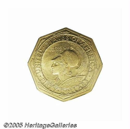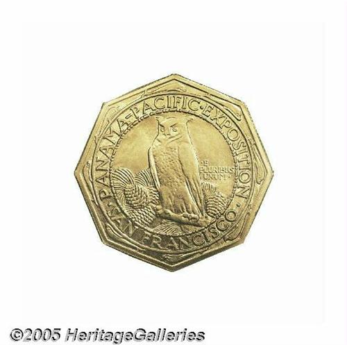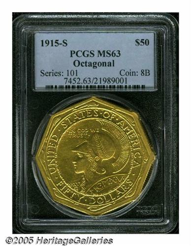 <B>1915-S<$50> Panama-Pacific 50 Dollar Octagonal MS63 PCGS.</B></I> A well struck, well preserved example of this very popular issue. Athena's face and helmet show no unsightly nicks or bumps to distract the eye, and the entire coin is awash in mint luster. Close examination will note some very minor lines, visible with a strong glass, and these are present on the vast majority of this issue. Recall that most of the Panama-Pacific Exposition coinage was sold to non coin collectors, with time and attrition taking a toll on these heavy coins. Many show rim bumps from being dropped or mishandled in some fashion, and locating a specimen in this grade can be a challenge. This coin is an excellent specimen for the grade and worthy of an advanced collection.<BR>The delightful designs include Athena on the obverse, eight dolphins tucked into the octagonal corners of the obverse and reverse, symbolizing the opening of the Panama Canal, the owl of wisdom and watchfulness on the reverse. The Canal greatly increased efficiency in shipping by eliminating the need to go around South America through the dangerous Straits of Magellan, which saved days at sea for any voyage from the Atlantic to the Pacific Ocean. San Francisco benefited greatly from the new canal, as its deep water bay allowed for many ships to be in port at the same time for loading and unloading of goods, which could then make a much quicker passage back to the East Coast or Europe. One of the most popular of all Commemorative issues, deservedly so, for the allegorical die work is exceptional and this is one of the few official $50 gold coins ever struck by the United States mints.