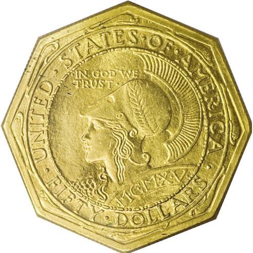 <B>1915-S $50 Panama-Pacific 50 Dollar Octagonal--Spot Removed--NCS. Unc Details.</B></I> The technical specifications for most commemoratives are fairly obvious. Typically, the law stipulates a weight and fineness identical to that of the existing denomination. Sometimes, however, there is no such precedent. The bimetallic Library of Congress ten dollar commemorative of 2000 is a modern example, but the coins of interest for classic commemorative collectors are the round and octagonal Panama-Pacific fifty dollar pieces of 1915. The fineness is identical to that of circulating coinage of the era, that is, .900 fine, alloyed with copper. These mammoth pieces stretch a full 1.74 inches (44.2 centimeters) from tip to tip on the octagonal, with a diameter of the same size for the round. They weigh 83.55 grams apiece, logical enough, given how close the value is to two-and-a-half times the weight of a double eagle. At the given fineness, this translates to more than 2.4 ounces of pure gold. The "slugs" of Augustus Humbert were 60 years in the past. These grand commemoratives were unlike anything most people had ever seen, but whether they recognized it or not these octagonal pieces were a numismatic tribute to the "slugs" from the Gold Rush days.<BR> The surfaces of this coin are an interesting study in themselves. It appears that there were several streaks of copper alloy on the obverse that eventually turned green. Someone saw these as a defect and tried to remove them. Unfortunately, it was not done with the greatest care. As a result, each green streak still remains but is now overlaid with noticeable (with a magnifier) hairlines. A few small contact marks are also located in the centers, but the coin appears quite pleasing at arm's length.<BR><BR><b>Shipping:</b> Coin/Currency (<a target="_blank" href="http://www.heritageauctions.com/common/shipping.php">view shipping information</a>)