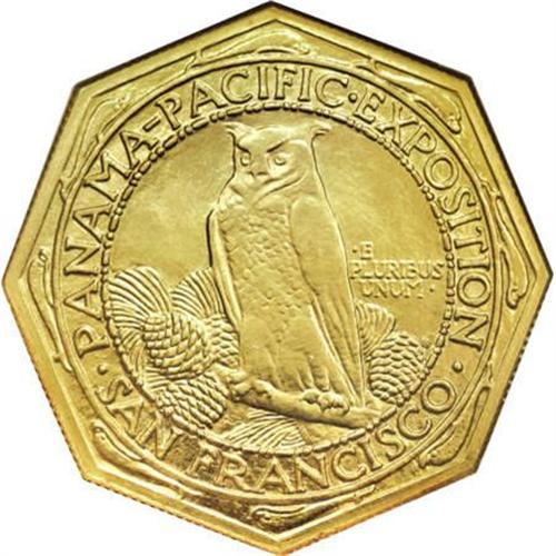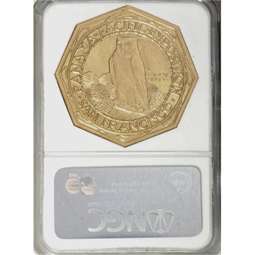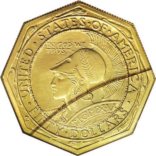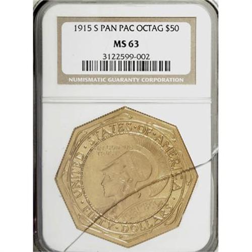 <B>1915-S $50 Panama-Pacific 50 Dollar Octagonal MS63 NGC.</B></I> While artists are afforded a certain latitude in creating designs for the Treasury, rarely do they have any influence over other factors, such as materials or dimensions. Yet Robert Aitken, who received the commission for the fifty dollar round and octagonal Panama-Pacific commemoratives, had a distinct, if not necessarily quantifiable, impact on the diameter of the pieces he designed.<BR> After meeting with a Mint official, Acting Director Dr. Frederick Dewey, and other artists, Aitken paid a visit to "the Numismatic Society," as he described it in a letter to Dewey that is quoted by Roger Burdette in his <I>Renaissance of American Coinage 1909-1915</B></I>. There, he discovered that the fifty dollar round pieces issued by private coiners and the half union pattern crafted by the U.S. Mint had varying diameters. When Aitken wrote to Dewey, the artist requested that the Mint official determine an appropriate diameter for the round fifty dollar piece, surmising that the dimensions of the round fifty dollar coin would necessarily affect the octagonal version if both formats used the same design. In his reply, Dewey advised Aitken to take the opposite approach, basing the diameter of the octagonal design on the original Augustus Humbert "slugs" and select the diameter best suited to use the octagonal design's motifs in a round format. While the Treasury would make the final determination, Aitken's influence is clear.<BR> This octagonal-format example, strongly lustrous for the issue, is yellow-gold with a touch of haze over each side. Few overt marks are visible on either side, though the surfaces show a few wispy abrasions. Well struck and fundamentally appealing, an important representative from a distinctive issue in the classic commemorative series. A regular, curved crack on the encapsulation appears on the obverse photo.<BR><I>Ex: Stack's, February 4-6, 1965, part of lot 717.<BR>From The John Stimson, Sr. Collection, Part Two.</B></I><BR><BR><b>Shipping:</b> Coins & Currency (<a target="_blank" href="http://www.heritageauctions.com/common/shipping.php">view shipping information</a>)