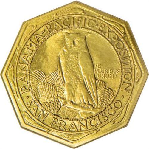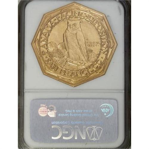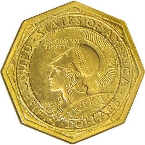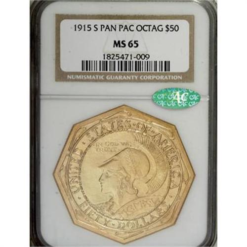 <B>1915-S $50 Panama-Pacific 50 Dollar Octagonal MS65 PCGS. CAC.</B></I> It was appropriate that the fifty dollar Panama-Pacific Exposition coins were produced in San Francisco. This was a tribute to events of the early Gold Rush years, in the vicinity of modern-day San Francisco, when two of the most prominent gold coins were the round and octagonal fifty dollar "slugs" that were minted, respectively, by the Wass Molitor company and by Augustus Humbert (first as United States Assayer of Gold, and later as the United States Assay Office of Gold). <BR> A certain amount of misinformation has been propagated concerning the octagonal Pan-Pac fifty dollar issue. For instance, according to <I>The Encyclopedia of United States Silver & Gold Commemorative Coins, 1892 to 1954 </B></I>(Swiatek and Breen, 1981), the first 100 pieces were struck on the grounds of the exposition itself, on June 15, 1915--the very first coin by Mint Superintendent T.W.H. Shanahan, the second by exposition president Charles C. Moore, and the next 27 examples by a succession of other dignitaries. This ceremonial event may have actually occurred, but, if so, it was at the San Francisco Mint, not on the grounds of the exposition. <BR> According to Roger Burdette, writing in the <I>Renaissance of American Coinage 1909-1915 </B></I>(page 265): "Enabling legislation limited production to 25,000 gold dollars, 10,000 quarter eagles, 3,000 quintuple eagles (both varieties combined) and 200,000 half dollars. The Legislation authorized production of the coins on the exhibition ground, but after a legal opinion from the treasury's solicitor that coins could only be struck within a mint, all coins were actually produced at the San Francisco Mint. Only souvenir medals were made as part of the Mint Bureau's display in the Mines Building."<BR> At least one published report of the coins' size is also inaccurate. In the <I>100 Greatest U.S. Coins</B></I>, by Garrett and Guth, the diameter of both the round and octagonal types is listed as 50.8 mm. In actuality, if measured from "point-to-point," the diameter of the octagonal variety is 49 mm. The round version has a diameter of 44 mm.<BR> The current offering is a magnificently preserved and visually stunning Gem representative of the Panama-Pacific octagonal fifty dollar type. Produced on a medal press that was shipped from Philadelphia to San Francisco just for the exposition, this specimen displays typically crisp and even definition of Robert Aitken's artistically impressive design elements. The lovely golden-orange coloration is highlighted by pleasing satin luster, and the coin's surfaces are remarkably clean.<BR> A truly splendid example of this classic American commemorative coin, and one that deserves the attention and respect of any serious numismatist.<BR><I>From The Southwest Collection.</B></I><BR><BR><b>Shipping:</b> Coins & Currency (<a target="_blank" href="http://www.heritageauctions.com/common/shipping.php">view shipping information</a>)