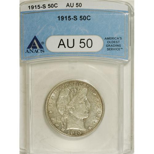 <B>1915-S 50C AU50 ANACS.</B></I> NGC Census: (4/256). PCGS Population (7/269). Mintage: 1,604,000. Numismedia Wsl. Price for NGC/PCGS coin in AU50: $225. (#6534)<BR><BR><b>Shipping:</b> Coins & Currency (<a target="_blank" href="http://www.heritageauctions.com/common/shipping.php">view shipping information</a>)