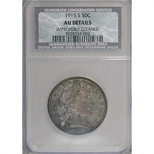 <B>1915-S 50C --Improperly Cleaned--NCS. AU Details.</B></I> NGC Census: (4/269). PCGS Population (9/287). Mintage: 1,604,000. Numismedia Wsl. Price for NGC/PCGS coin in AU50: $225. (#6534)<BR><BR><B>Coin Engraver:</B> Charles E. Barber<BR><BR><b>Shipping:</b> Coins & Currency (<a target="_blank" href="http://www.heritageauctions.com/common/shipping.php">view shipping information</a>)