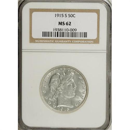 <B>1915-S 50C MS62 NGC.</B></I> NGC Census: (49/158). PCGS Population (33/173). Mintage: 1,604,000. Numismedia Wsl. Price for NGC/PCGS coin in MS62: $433. (#6534)<BR><BR><B>Coin Engraver:</B> Charles E. Barber<BR><BR><b>Shipping:</b> Coins & Currency (<a target="_blank" href="http://www.heritageauctions.com/common/shipping.php">view shipping information</a>)