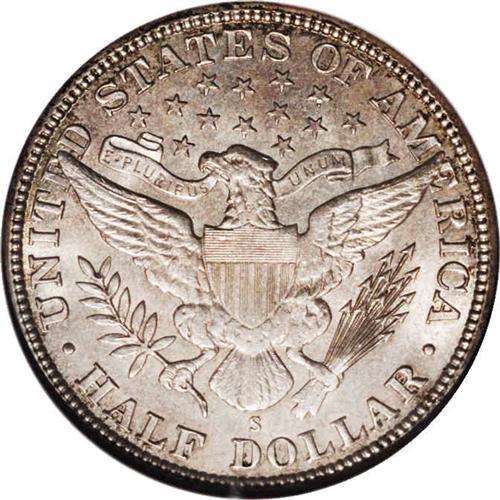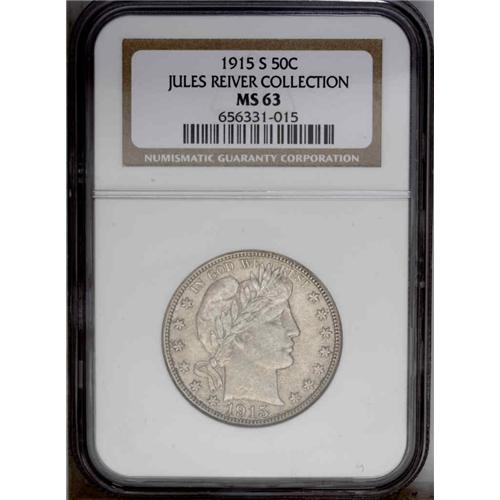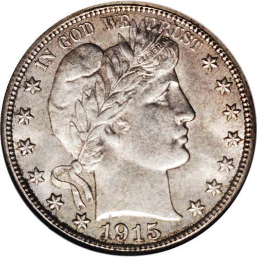 <B>1915-S<50C> MS63 NGC.</B></I> Frosty luster. Intermingled gold and gray iridescence complements both surfaces. The strike is average with softness noted at the eagle's plumage and claws. Virtually all peripheral design features are sharp including the obverse stars and reverse inscriptions.