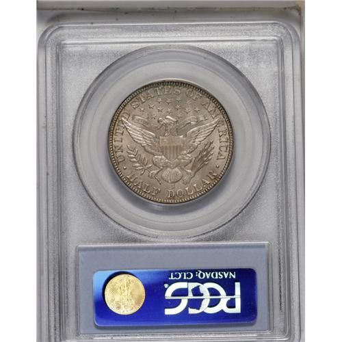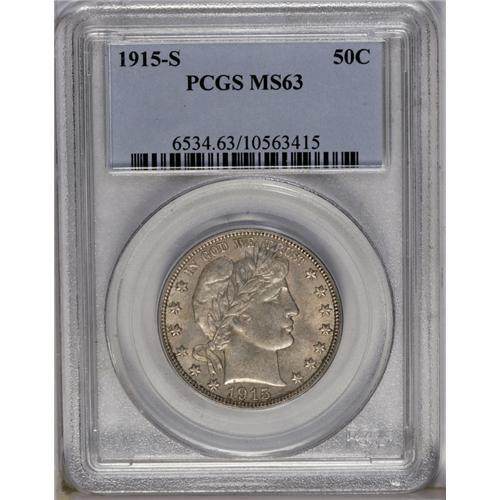 <B>1915-S<50C> MS63 PCGS.</B></I> Blended golden-brown and dove-gray coloration graces this satiny and smooth Barber half. Moderate strike incompleteness on portions of the eagle is all that prevents a finer grade.