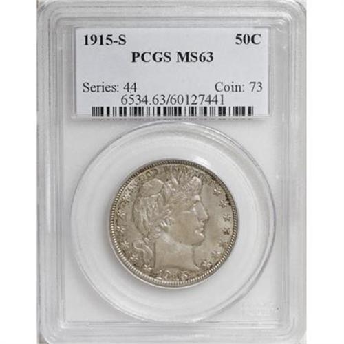<B>1915-S 50C MS63 PCGS.</B></I> An attractive Select example of this final-year Barber half issue, well struck with silver-gray centers and dots of deeper forest-green, orange, and sage toning near the rims. A pleasing survivor from this issue of just over 1.6 million pieces.<BR><BR><B>Coin Engraver:</B> Charles E. Barber<BR><BR><b>Shipping:</b> Coins & Currency (<a target="_blank" href="http://www.heritageauctions.com/common/shipping.php">view shipping information</a>)