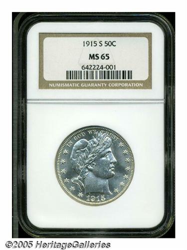 <B>1915-S<50C> MS65 NGC.</B></I> Fully brilliant with bright, semi-reflective luster and razor sharp definition over the highpoints. Popular as the final year of type and a challenging coin in Gem condition. Population: 33 in 65, 8 finer (6/05).
