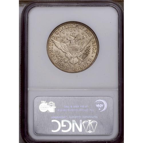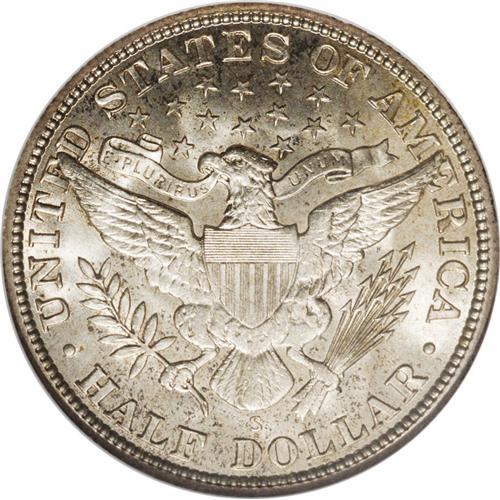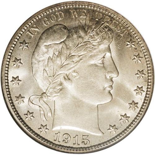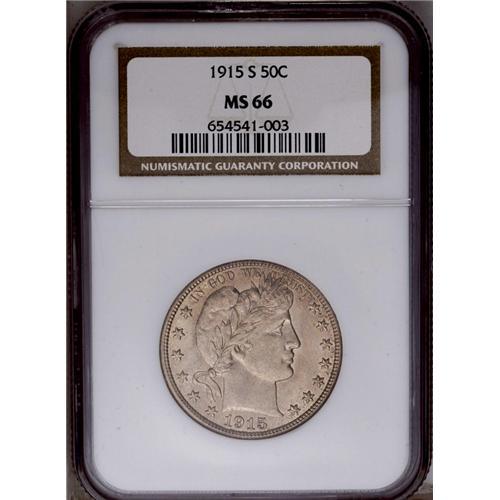 <B>1915-S<50C> MS66 NGC.</B></I> The type coin status of this late date S-mint issue dissipates rapidly as one climbs above the MS65 grade level. This is a lovely, original specimen whose frosty surfaces show delicate sunset-rose and dove-gray iridescence. The strike is quite sharp and a noteworthy departure from the often seen branch mint Barber half dollar. Virtually unmarked, a single tiny abrasion is noted under Liberty's ear. Both major grading services report 10 examples in MS66 with a scant four finer (4/06).