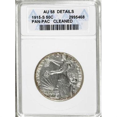 <B>1915-S 50C Panama-Pacific--Cleaned--ANACS. AU58 Details.</B></I> NGC Census: (78/2193). PCGS Population (142/2516). Mintage: 27,134. Numismedia Wsl. Price for NGC/PCGS coin in AU58: $380. (#9357)<BR><BR><b>Shipping:</b> Coins & Currency (<a target="_blank" href="http://www.heritageauctions.com/common/shipping.php">view shipping information</a>)