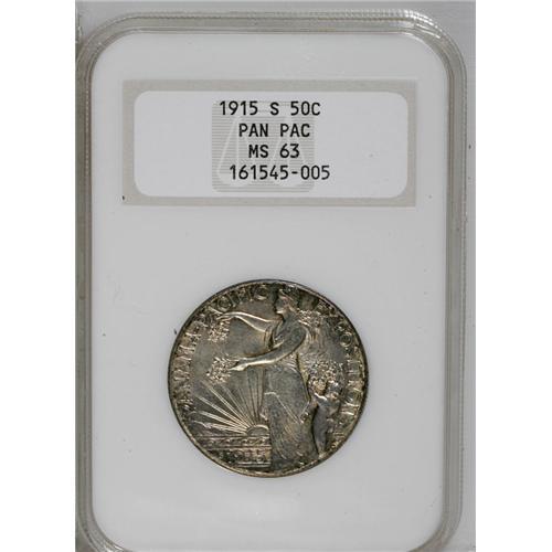 <B>1915-S<50C> Panama-Pacific MS63 NGC.</B></I> Select and heavily toned gunmetal and lavender. The luster is somewhat subdued for this issue, but the strike is sharp.