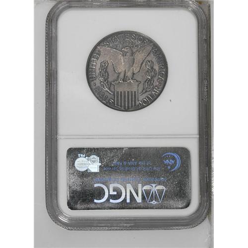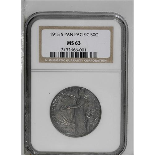 <B>1915-S<50C> Panama-Pacific MS63 NGC.</B></I> While not the highest-graded example, this coin has plenty of eye appeal, much of it stemming from the exquisite violet patina that covers both sides. Lustrous and well struck with light marks.