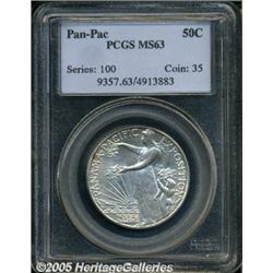 <B>1915-S 50C Panama-Pacific MS63 PCGS.</B></I> A brilliant example of this scarce and always-popular Commemorative Half. The lack of color allows the coin's original mint brilliance to shine brightly through unimpeded and unfiltered. An exquisite example of this beautifully executed Half.