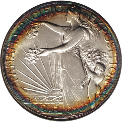 <B>1915-S 50C Panama-Pacific MS64 NGC.</B></I> Beautiful powder-blue and golden-brown colors endow the borders of this lustrous and crisply struck near-Gem. Slightly coarse surface near the R in AMERICA appears to be as made.