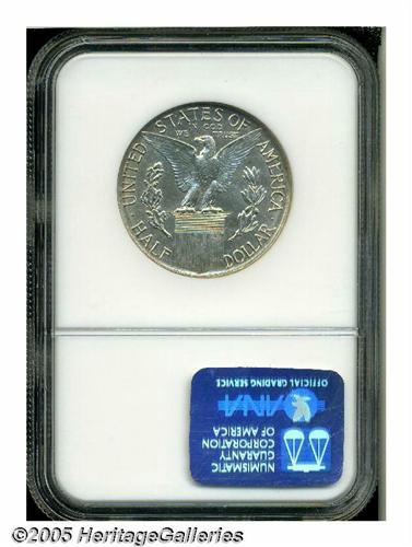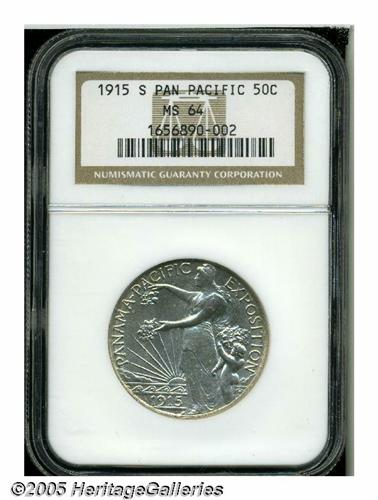 <B>1915-S<50C> Panama-Pacific MS64 NGC.</B></I> The delicate gold color slightly deepens at the borders. A richly struck and satiny near-Gem of this better type. Quite clean for the assigned grade.