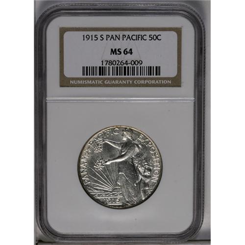 <B>1915-S<50C> Panama-Pacific MS64 NGC.</B></I> This brilliant and satiny example is attentively struck. No mentionable marks are detected. The mintmark is repunched east. An early and better silver type.