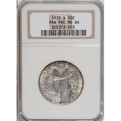 <B>1915-S 50C Panama-Pacific MS64 NGC.</B></I> Golden-tan patina concentrates at the margins of this near-Gem commemorative. Lustrous and well struck. A couple of obverse milling marks limit the grade.<BR><BR><b>Shipping:</b> Coins & Currency (<a target="_blank" href="http://www.heritageauctions.com/common/shipping.php">view shipping information</a>)