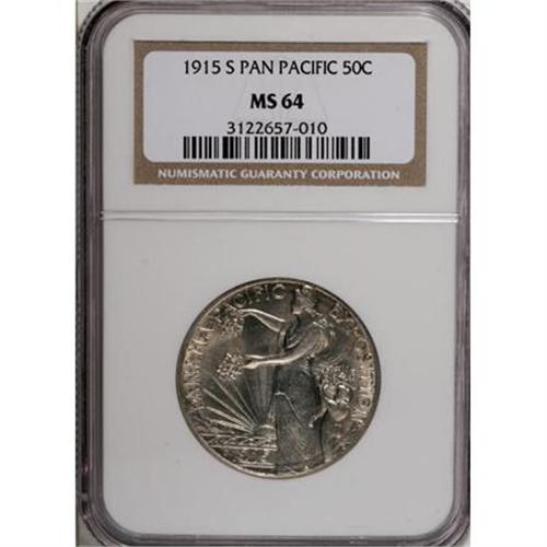 <B>1915-S 50C Panama-Pacific MS64 NGC.</B></I> A satiny near-Gem with faint obverse toning and deeper reverse toning over fully brilliant and lustrous surfaces.<BR><BR><b>Shipping:</b> Coins & Currency (<a target="_blank" href="http://www.heritageauctions.com/common/shipping.php">view shipping information</a>)