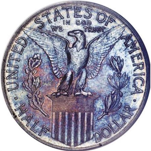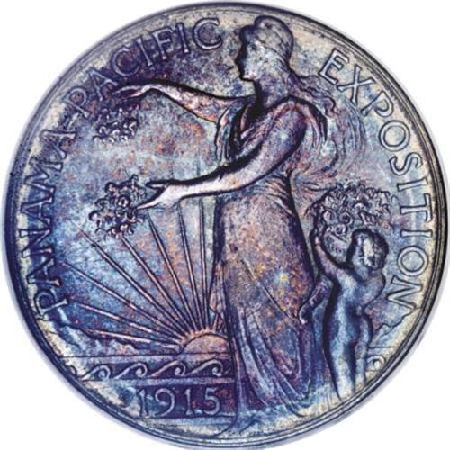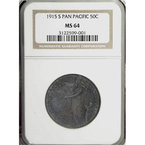 <B>1915-S 50C Panama-Pacific Half Dollar MS64 NGC.</B></I> Elegant blue-green, violet, and rose shadings grace the luminous surfaces of this solidly struck near-Gem. Light flaws are evident on each side, yet the overall visual appeal remains strong for the grade assigned.<BR><I>Ex: Stack's, February 4-6, 1965, part of lot 717.<BR>From The John Stimson, Sr. Collection, Part Two.</B></I><BR><BR><b>Shipping:</b> Coins & Currency (<a target="_blank" href="http://www.heritageauctions.com/common/shipping.php">view shipping information</a>)