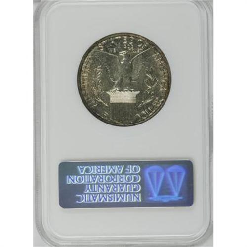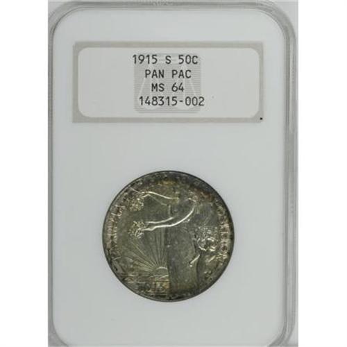 <B>1915-S 50C Panama-Pacific MS64 NGC.</B></I> The mintmark is faintly (but widely) repunched north. A flashy near-Gem with lovely autumn-brown and aquamarine peripheral toning. Boldly struck and unabraded. In a prior generation holder.<BR><BR><b>Shipping:</b> Coins & Currency (<a target="_blank" href="http://www.heritageauctions.com/common/shipping.php">view shipping information</a>)