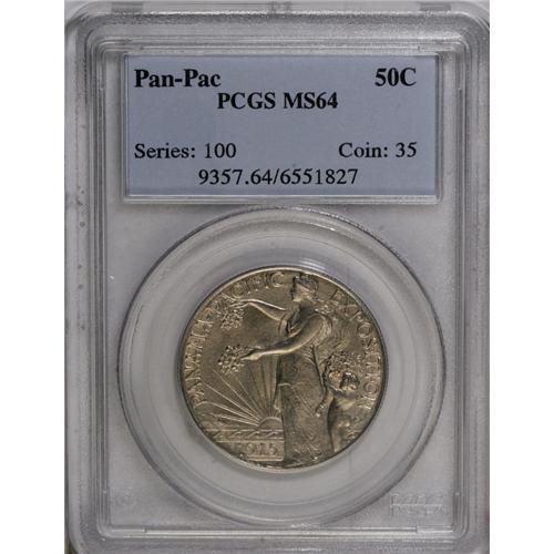 <B>1915-S<50C> Panama-Pacific MS64 PCGS.</B></I> A satiny and lightly toned near-Gem without relevant marks. Given its mintage, the Panama-Pacific half is surprisingly scarce in better Mint State grades. The mintmark is lightly repunched north.